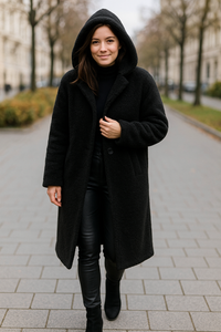 Wikkel jezelf in comfort terwijl je moeiteloos stijlvol blijft dit seizoen. Deze lange pluche jas voor dames heeft een warme capuchon en een gestroomlijnde eenknoopssluiting, perfect voor frisse herfst- en winterdagen. De zachte pluche stof voegt zowel warmte als luxe toe, waardoor het een veelzijdig stuk is voor dagelijks gebruik. Het lange silhouet biedt bedekking en elegantie zonder zwaar aan te voelen. Combineer hem met een legging of skinny jeans en laarzen voor een complete, modieuze look.