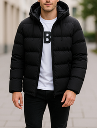 Blijf warm zonder extra volume in deze winterjas met capuchon voor heren, ontworpen voor modern streetwear-comfort. De lichtgewicht gewatteerde constructie biedt isolatie en zorgt ervoor dat je er strak en veelzijdig uitziet. Het effen ontwerp en de volledige ritssluiting geven je dagelijkse outfit een zelfverzekerde uitstraling. Of je nu naar je werk gaat of een weekendje weg bent, deze jas biedt warmte en bewegingsvrijheid in elk seizoen. Combineer hem met een slim fit jeans of cargo joggingbroek om de look af te maken.