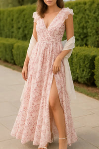 Dames Zomer Maxi Jurk, Diepe V-Hals Slim Fit Met Ruches, Open Rug Bloemige Vakantie Look | VIQA