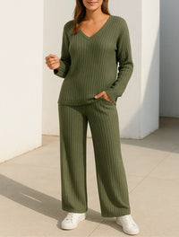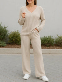 Stap in tijdloos comfort en stijl met deze 2-delige broek en top set, ontworpen voor herfst en winter. De zachte gestreepte stof geeft het een verfijnd randje, terwijl de ontspannen top met v-kraag een vleugje elegantie toevoegt. Deze set is perfect voor casual dagen, kantoorkleding of gezellige avonden en combineert verfijning met draagbaarheid voor elke dag. Trek iets aan dat goed voelt en er gepolijst uitziet. Combineer het met enkellaarsjes of strakke sneakers om je outfit compleet te maken.