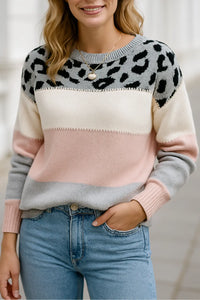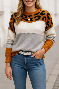 Dames Gebreide Trui, Kleur Blok Luipaard Print, Ronde Hals Lange Mouwen Casual Top | VIQA VIQA© NEDERLAND