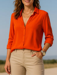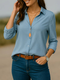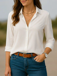 Deze dames zomer blouse met lange mouwen combineert ademend comfort met een verfijnde stijl. Ontworpen met een ontspannen pasvorm en een elegante reverskraag, is hij perfect voor zowel op kantoor als daarna. Deze lichtgewicht maar gepolijste blouse flatteert elke vorm en biedt een sierlijke drapering die zelfs de eenvoudigste look verheft. Deze blouse is ideaal om in de zomer te dragen en biedt gemakkelijke verfijning zonder afbreuk te doen aan comfort. Combineer hem met een jeans met hoge taille of een getailleerde broek om een chique outfit compleet te maken.Dames Zomer Blouse, Lange Mouw Elegant Kapsel Shirt, Los Fit Kantoor Tuniek Top | VIQA VIQA© NEDERLAND