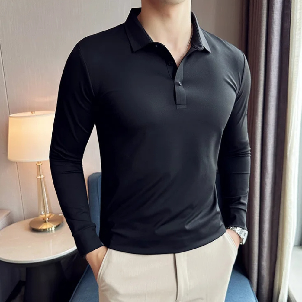 Ervaar ultiem comfort met onze herenpolo met lange mouwen van ijszijde, gemaakt van eersteklas ijszijde. Dit stevige, casual shirt met lange mouwen heeft een slanke pasvorm, perfect voor de herfst. Ontworpen voor stijl en functionaliteit, is het de ideale basis top voor elke casual gelegenheid, met een strakke look en ongeëvenaard comfort.