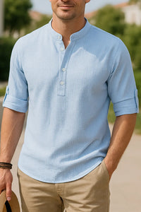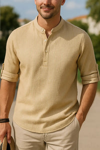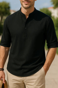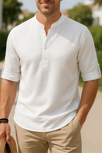 Geef uw dagelijkse outfit een boost met dit opvallende, ademende herenshirt met lange mouwen, ontworpen voor mannen die van een ontspannen maar toch opvallende look houden. De moderne halfopen voorkant en opstaande kraag zorgen voor een nonchalante stijl, perfect voor casual uitstapjes of weekendjes weg. Het shirt is lichtgewicht en ademend, gemaakt voor comfort de hele dag door zonder in te boeten aan stijl. De knoopsluiting zorgt voor een verfijnde touch terwijl het shirt toch nonchalant blijft. Combineer het met een chino, denim short of linnen broek voor een complete look die de aandacht trekt.